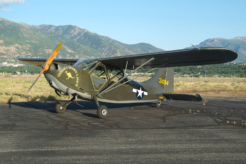 This aircraft was purchased in May, 2007 in Kansas City. It is painted in the same markings (except tailnumber) of an aircraft “Swamp Angel” that flew with the 25th Liaison Squadron, 71st Recon Group, 5th Air Force that operated out of New Guinea in 1944. The aircraft was marked when purchased and so I did some research on the name “Swamp Angel”. It turns out that my aircraft was in an aviation magazine from 1988 just after it was restored that talked some about the name chosen. The original aircraft (crashed in 1945) was flown by Sgt. John Shannonhouse of Louisiana and I was able to find his wife. She graciously loaned me original photos of the aircraft. This actual aircraft (42-14914) was delivered to the Army Air Corps on 31 March, 1943 and did not go overseas but was used stateside. It was in the first batch of L-5s built and is number 117 of about 3500 built. Strangely enough, this aircraft was assigned to the stateside departure base of the 25th Liaison Squadron at the time they were shipped overseas. So in all likelyhood, Sgt Shannonhouse actually flew this aircraft while there.